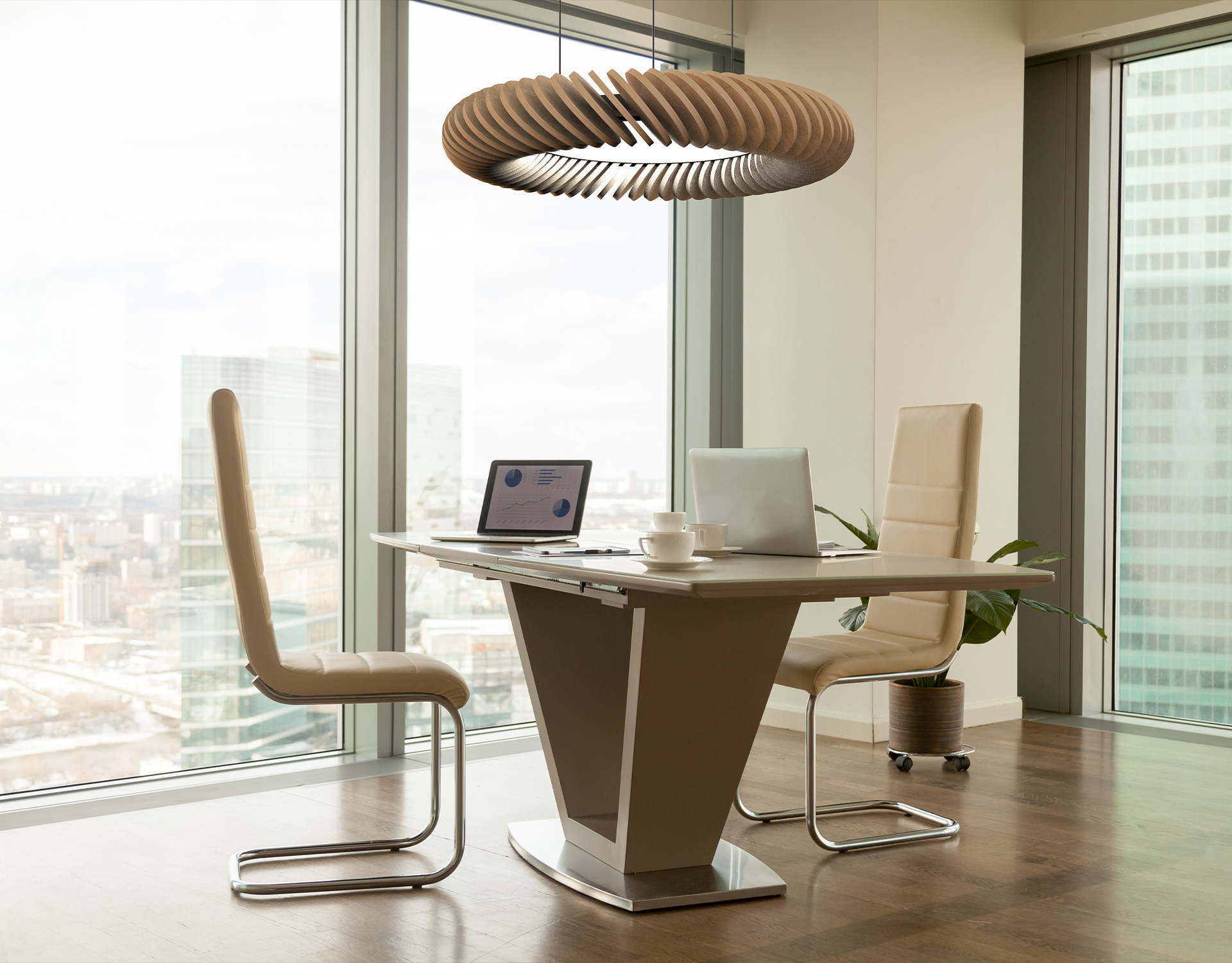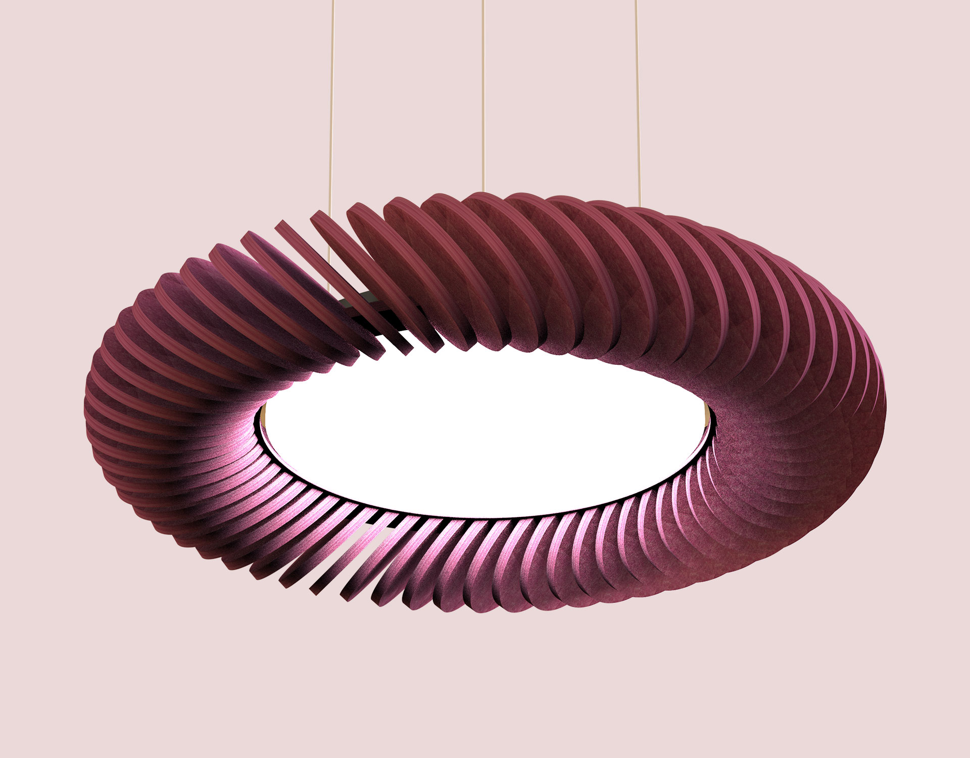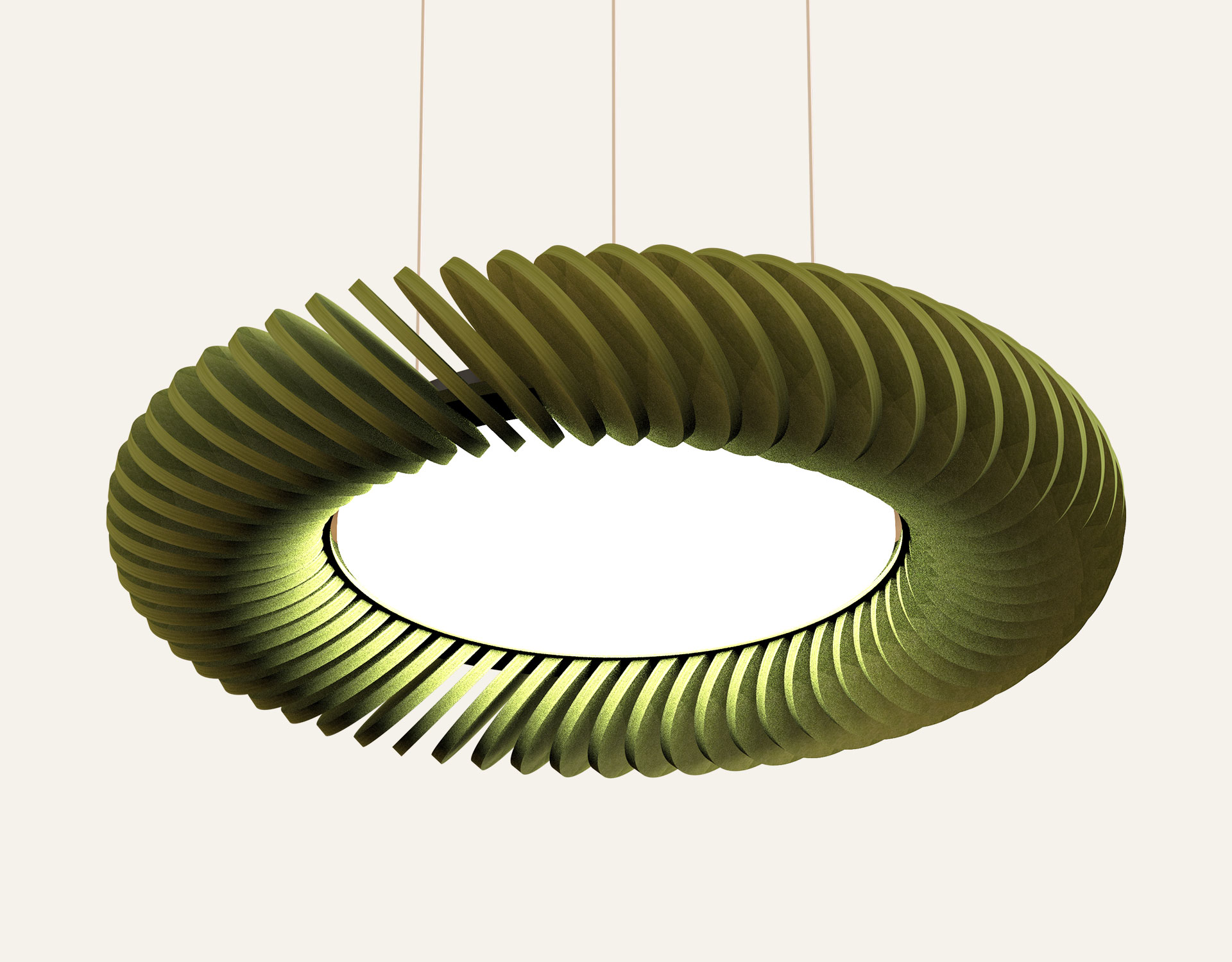 Loop is a designer acoustic spinned luminaire with its shape resembling a ring from our collection of pendant lights. The housing is made of acoustic shades connected to create a homogenous appearance. With specially formed LED modules as its power source, that gives it a magnificent look and feel. Well-suited luminaire in architectural spaces, office workstations, reception area, and cafeteria/dining area. Available in various sizes with unique acoustic shade options.